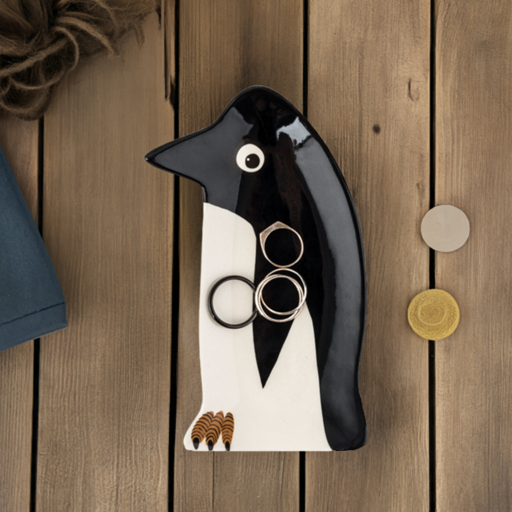 With a beady eye watching over your jewels, this penguin-themed trinket dish is designed in London and handmade from stoneware ceramic.