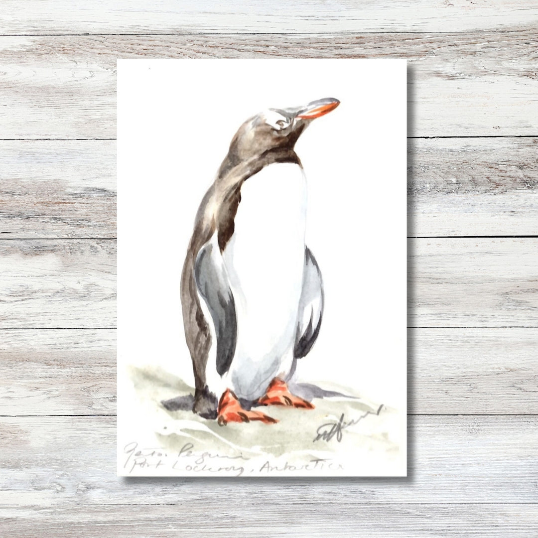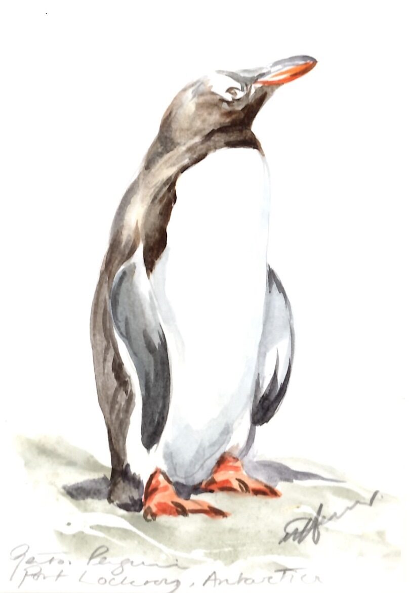 An original watercolour of a gentoo penguin, hand-painted by Orkney-based artist, Una Hurst.